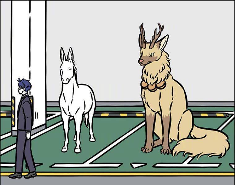 当然有时候也会发生意外,比如这天,文昌帝君一如往常骑着白骡出行,随后便将白骡停放在放置神兽的停车场,此时白骡身边站着的则是大士的赛太岁。